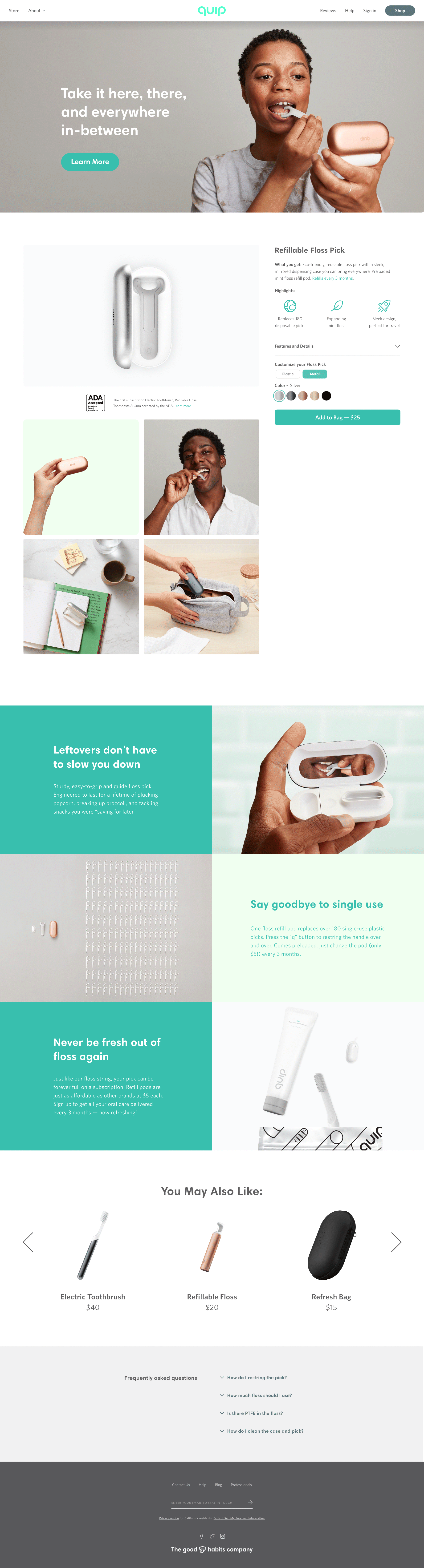 Launch CampaignReusable and endlessly restringable, quip’s Refillable Floss Pick is an eco-friendly alternative to single-use plastic floss picks. To showcase the beauty of the product and its functionality, we utilized a minimal yet warm-toned art direction paired with playful illustrations throughout all brand applications.